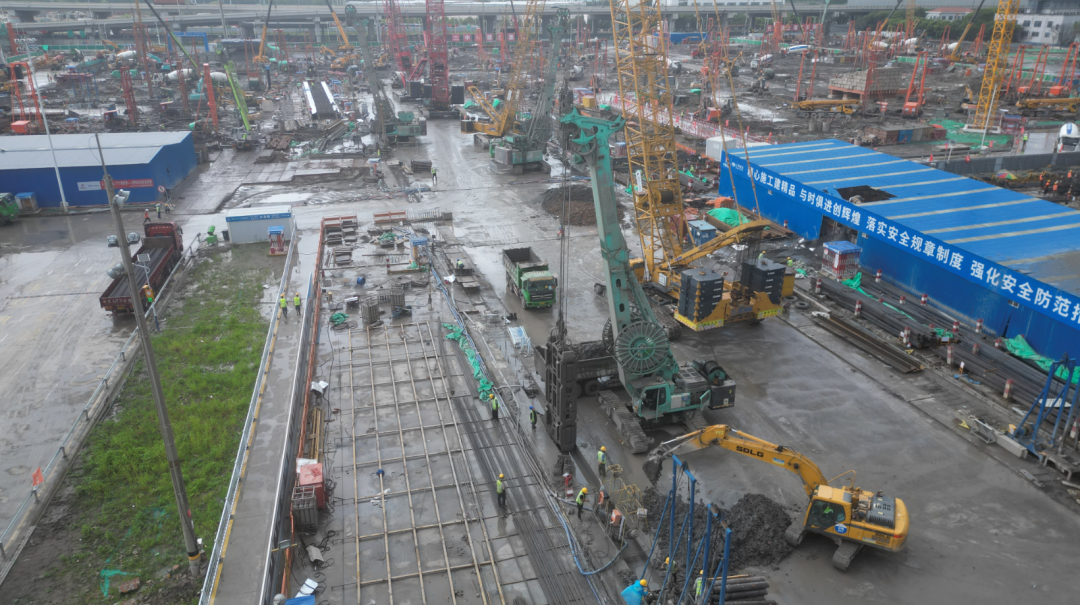 宝山高铁站地下连续墙工程面临多重施工挑战:首先,近期上海持续高温、台风、强降雨等恶劣天气情况,地表温度超70℃,对工程人员体能、设备稳定性构成极大考验;其次,工程需完成槽宽1.2m、槽深63m的超深地连墙施工,突破常规作业深度;第三,工期紧张,每幅槽作业时间严格控制在15-16小时,对设备性能与施工组织提出极高要求。